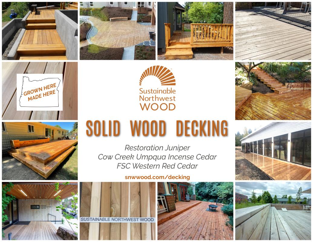 If your Deck Check results in thinking it's time to replace it, OR if you simply want to expand your outdoor living space, we've got you covered. With three local, sustainable wood species available in solid wood decking, you can upgrade the situation and support a network of small, family owned and Tribal businesses. Click here for More details on our Decking Page