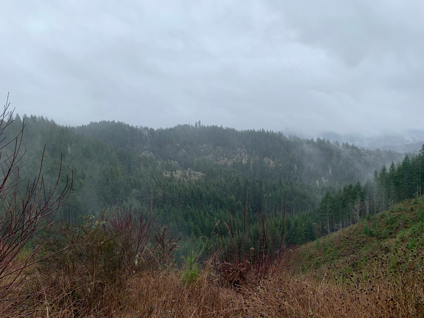 As we pulled away from a great view of the Umpqua River, we started to climb up gravel roads. The higher we went the harder the wind and rain blew until we stopped at a pull-out with a view down to a deep valley surrounded by tree topped ridges. Allan used this vantage to give me a geography lesson of the 410-acre Elkton Reserve. The Reserve lies within an Oak Woodlands Conservation Opportunity Area as defined in the Oregon Conservation Strategy. The long-term value of the Reserve rests with its guarantee of a 99-year easement intended to benefit the public trust.