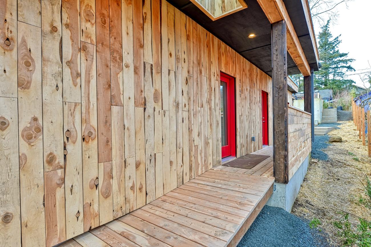 One of the sustainable elements of the project is the exterior siding, an open joint rainscreen, made with Restoration Juniper rough sawn fence boards from Sustainable Northwest Wood. Juniper is being harvested in Eastern Oregon as part of grassland and watershed restoration efforts. Sustainable Northwest Wood partners with a network of small rural mills to distribute and sell the resulting wood from the restoration projects, offering a variety of useful products such as siding, decking, garden & landscape lumber, flooring, butcher block and more. Juniper has natural aromatic oils, making it incredibly resistant to rot and decay. The siding material was left untreated to allow it to grey out over time, providing a natural element to the exterior. Complementing the modern-rustic façade are pops of red in the clean lines of the Cascadia triple- paned fiberglass windows. Restoration Juniper was also selected for the decks and a thoughtfully planned ramp leading to the entrance to accommodate future mobility needs as the couple ages.