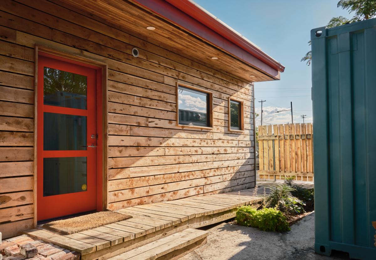 • Restoration Juniper from grassland restoration projects is utilized throughout including: Rough sawn timbers for the planters next to the front steps, juniper decking for the ramp, and rough sawn fence boards for the exterior siding at the back of the building