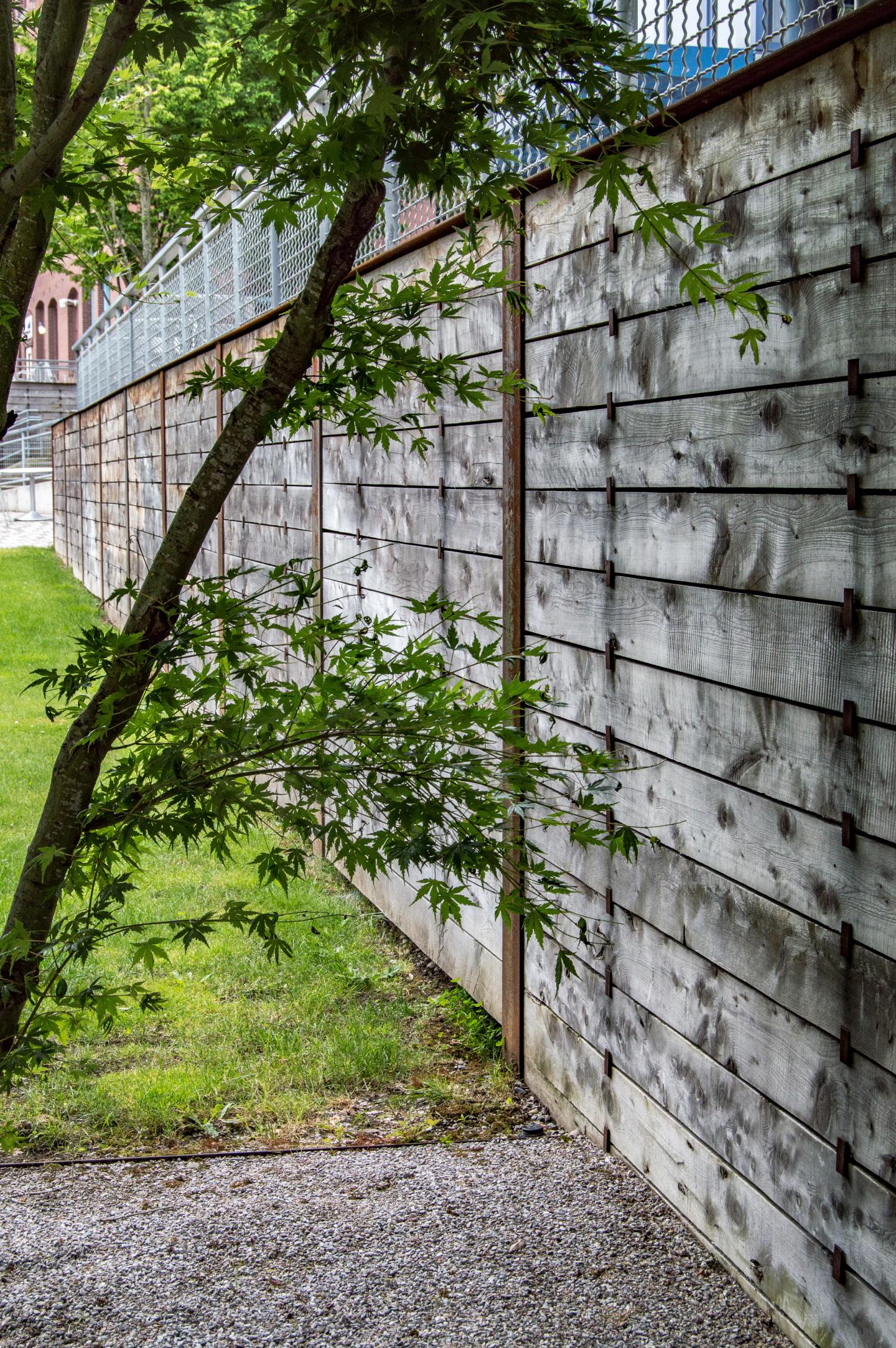 Juniper supported with iron anchors weathers to a silver gray over time and adds natural beauty at the campus of University of Washington, Tacoma