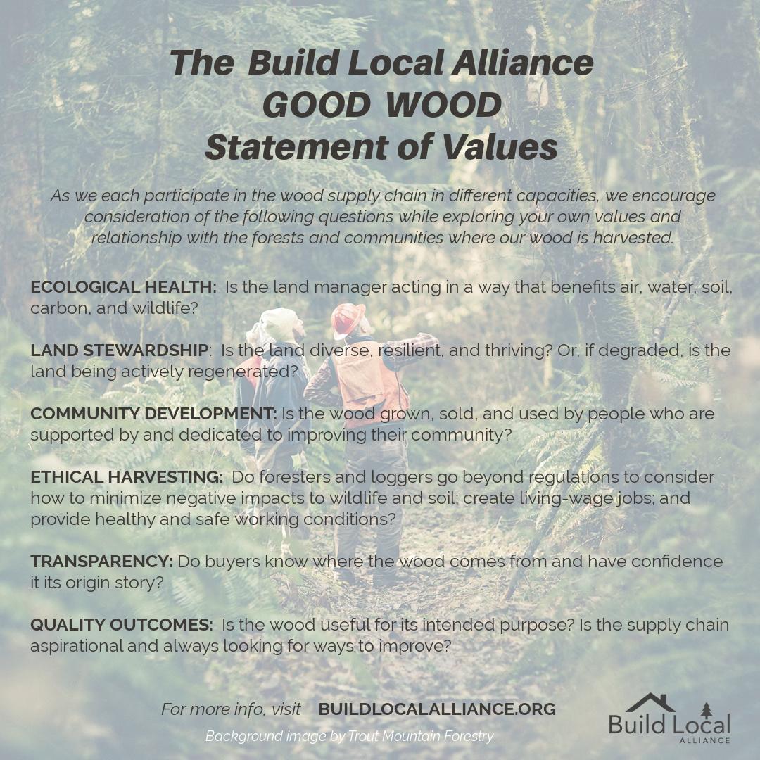The Build Local Alliance Mission – to improve the vitality of local forest and related human communities by connecting local responsibly grown and processed wood with local wood products.