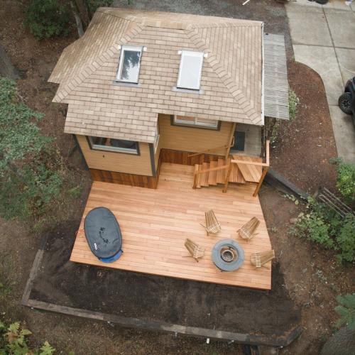 Routine sweeping and cleaning away debris, moss and algae are vital for the long life of your deck. Like all natural wood left exposed to sunlight and weather, both juniper and cedar will turn gray over time if left untreated. This can be delayed or prevented through the application of sealers or stains and can further extend the life of the wood. We love and recommend Portland based TimberPro Coatings for deck care and maintenance products.